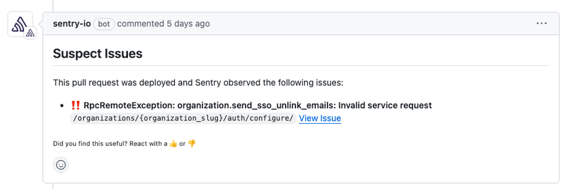 Know if a merged pull request is causing issues. Sentry will comment on merged pull requests that are causing Sentry Issues.