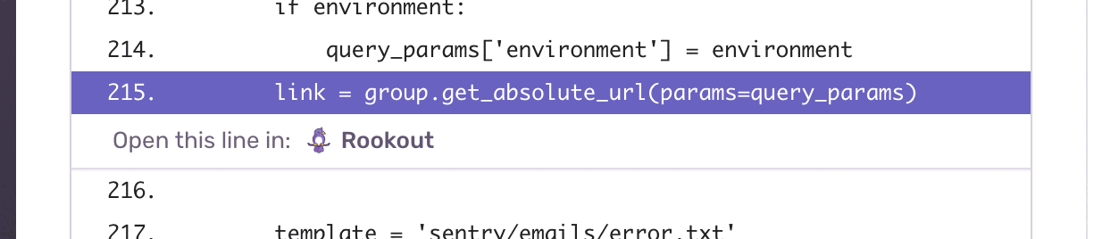 After identifying the location of an error, Sentry prompts you to debug the issue — live, in production — in Rookout. With a click of a button, you'll see the same line of code highlighted in Rookout's IDE-like interface.